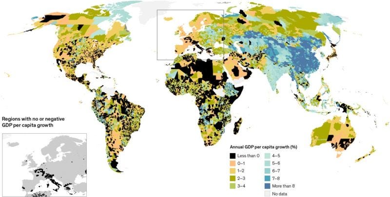 We often see images of national-level GDP growth, but hereâs an image of sub-national GDP growth from 2000â2019. Itâs from a new paper by AndrĂŠs Rodriguez-Pose.