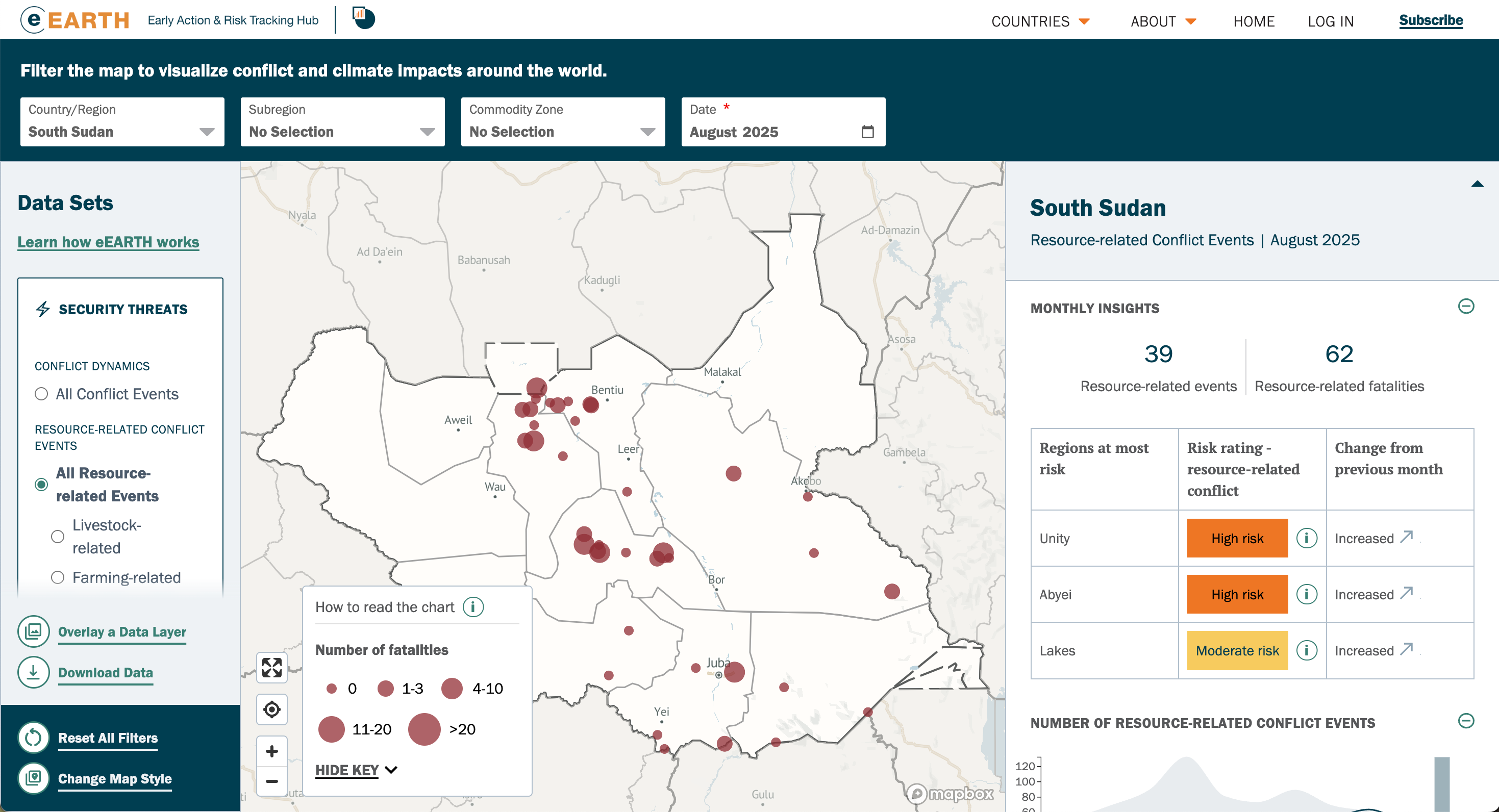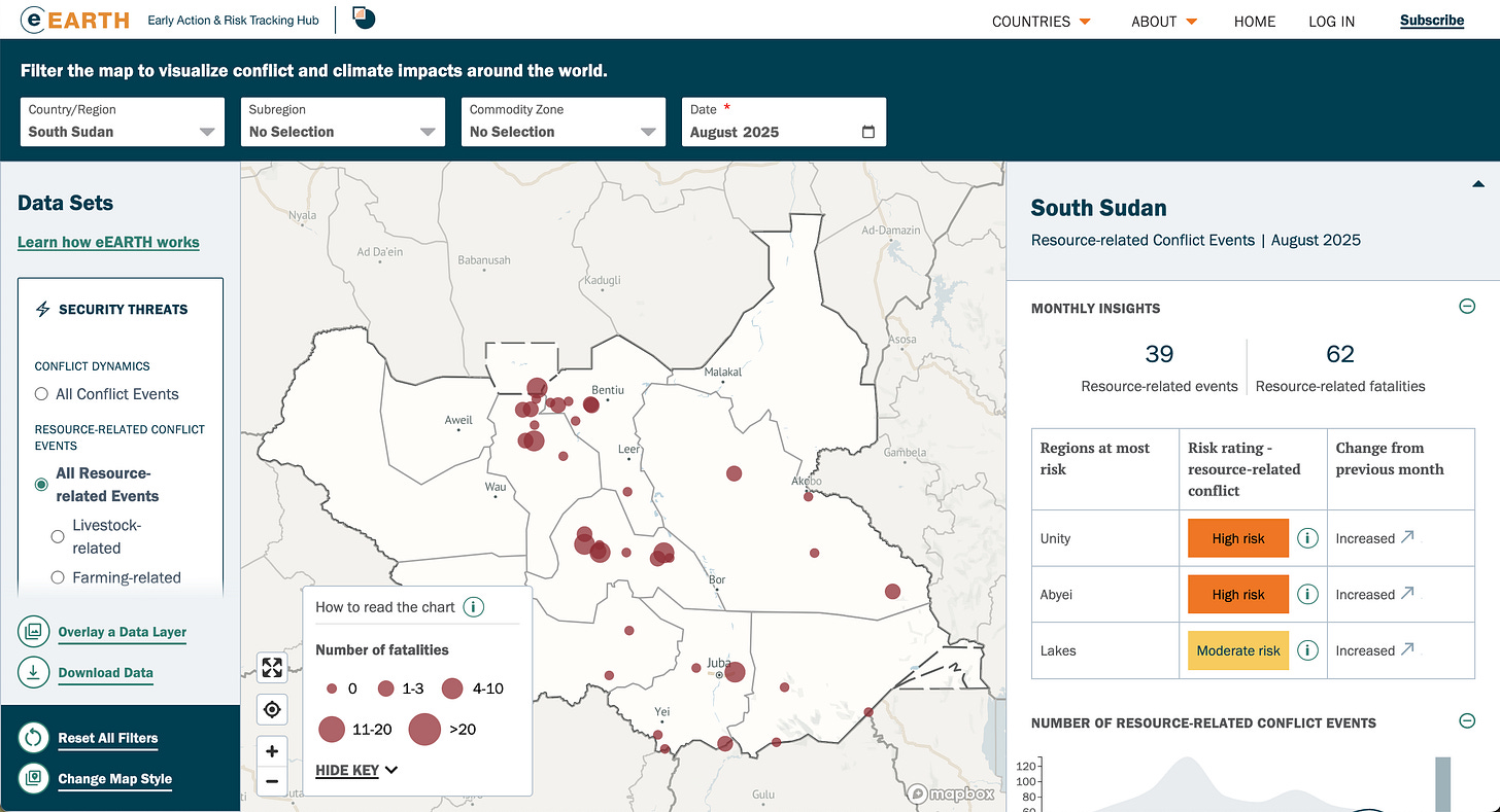 The International Crisis Groupâs eEARTH platform combines climate, conflict, displacement, and food security data into one intuitive hub. With map-based visuals, monthly updates, and built-in forecasts, it helps decision-makers cut through data overload to spot risks and act early