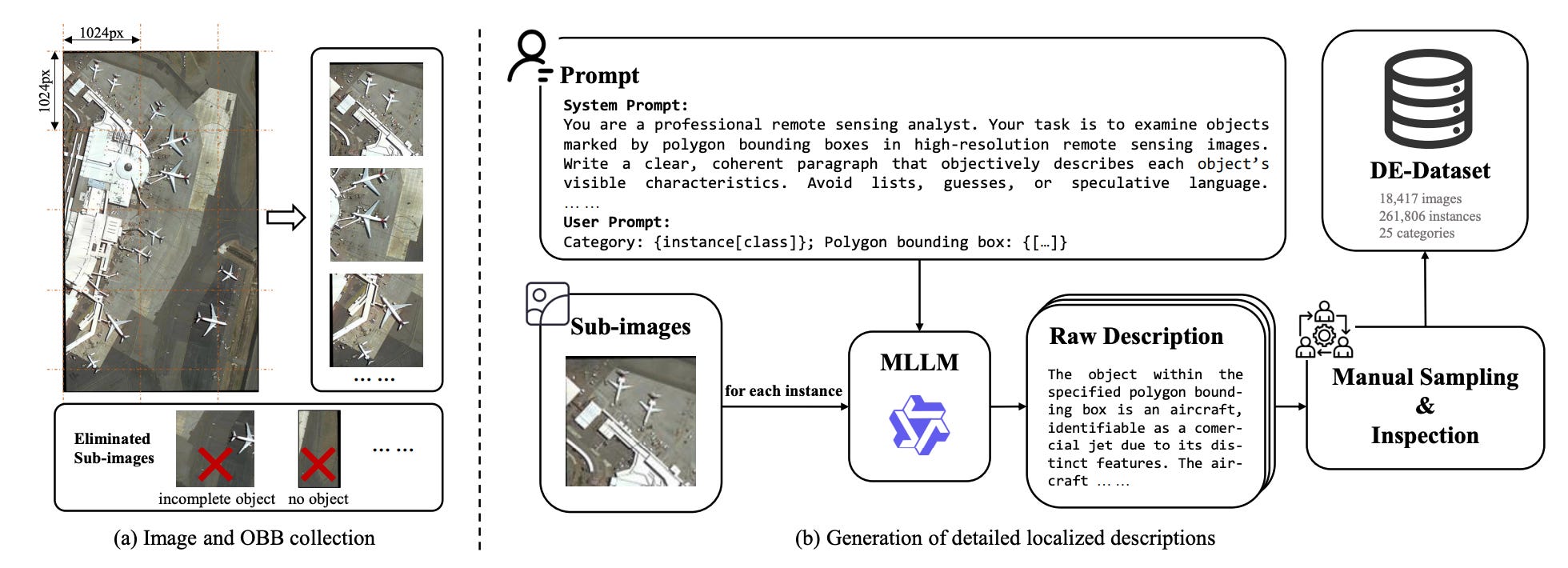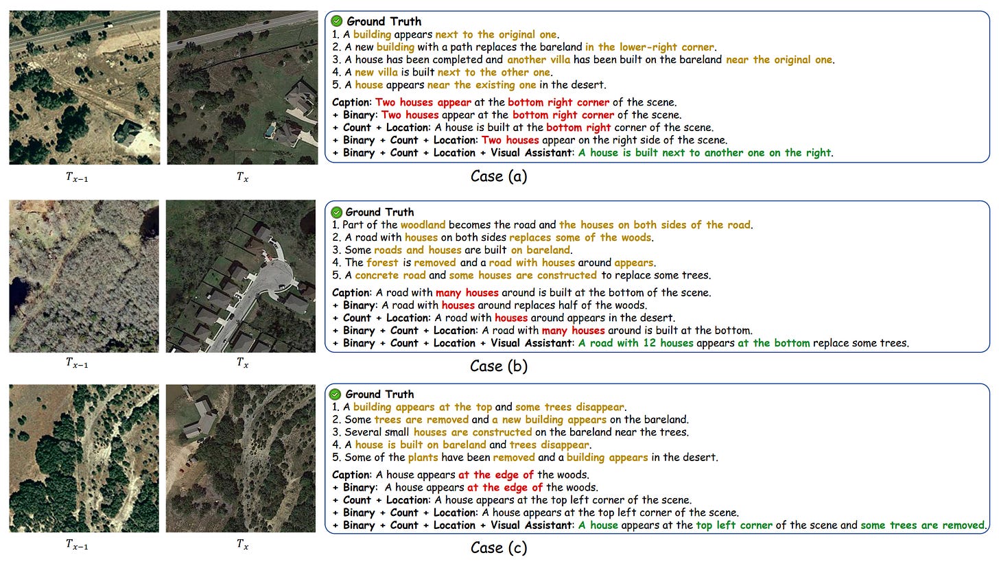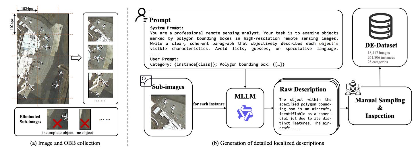 A new paper introduces DescribeEarth, a large multimodal model designed to generate detailed natural language descriptions of objects in satellite images. If youâve been following this newsletter, youâll have noticed there seems to be a recent trend towards creating labels for satellite images. While most image captioning models produce short summaries of entire scenes, this approach focuses on Geo-DLC (geographical detailed local captioning): describing specific locations or objects, such as a single airport, dam, or ship. To support this, the authors built DE-Dataset, a large collection of over 260,000 labelled instances, each paired with a fine-grained description averaging around 120 words. The descriptions were created using a mix of multimodal models (like Qwen2.5-VL-32B) and human verification, ensuring both factual accuracy and consistency.