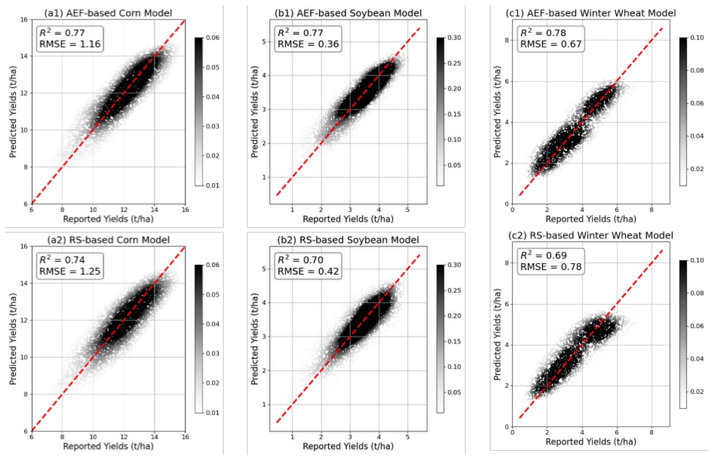 However, the study uncovered some serious limitations when the models were pushed further. AEF struggled quite a bit with âspatial transferabilityâ, which means a model trained in the eastern Corn Belt failed completely when tested in the west. Traditional satellite metrics handled this shift much better because they are based on consistent physical properties of plants. Additionally, AEF is a âblack boxâ, so users have no idea what a feature like âA05â actually represents physically, unlike an index like NDVI which directly measures vegetation vigour. This lack of interpretability suggests that while foundation models are powerful, we canât quite ditch our physics-based indices just yet.