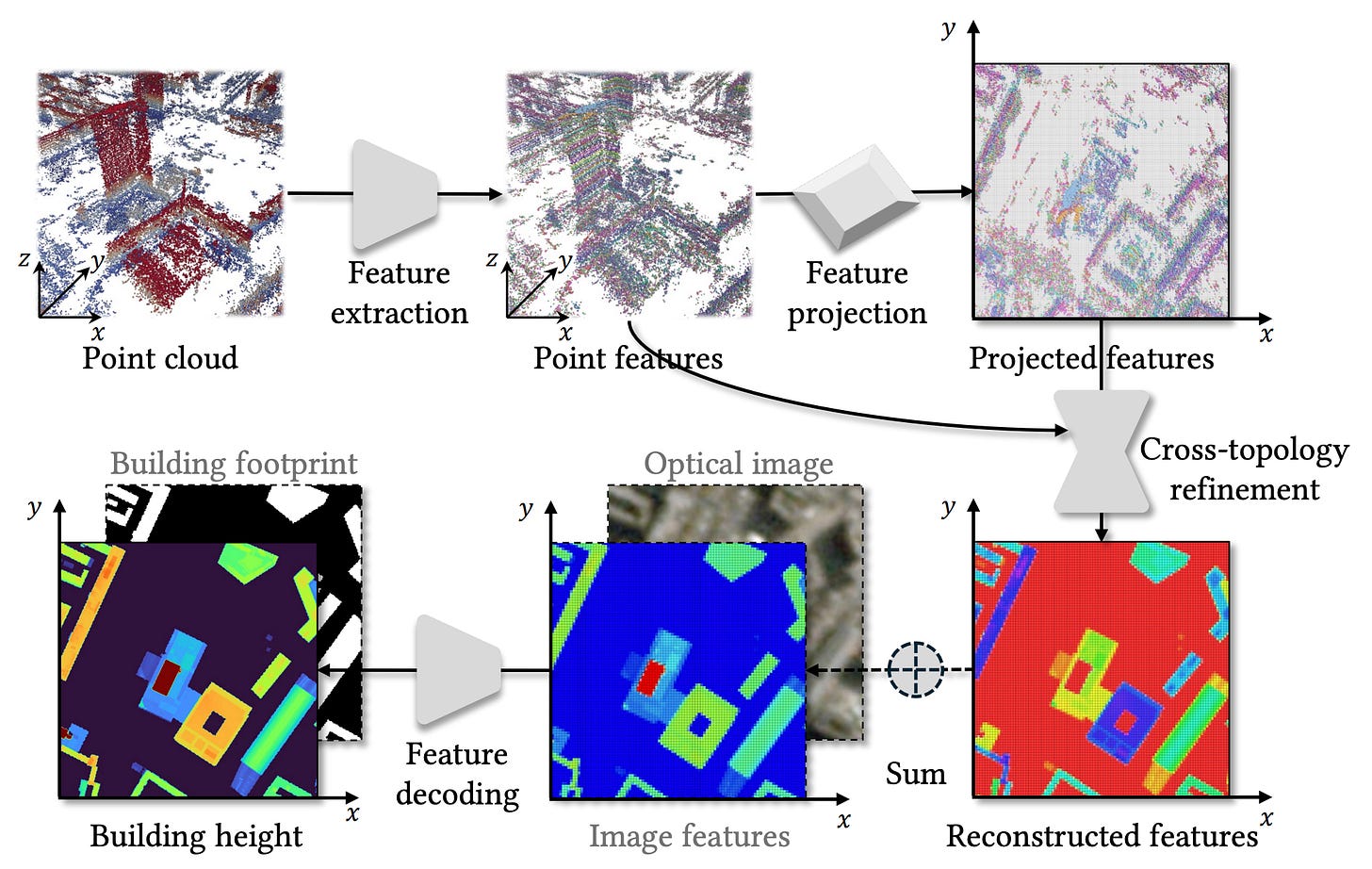 The main part of their approach is a âdual-topologyâ network that toggles between two different ways of looking at the data. One branch processes the irregular 3D points to capture structural details, while a second branch projects everything onto a 2D grid to enforce spatial consistency. By constantly exchanging information between these two views, the model effectively learns to denoise the data and fill in the missing blanks where the radar signal didnât bounce back. This allows it to generate continuous height estimates even from sparse inputs, without needing an external terrain model to tell it where the ground is.