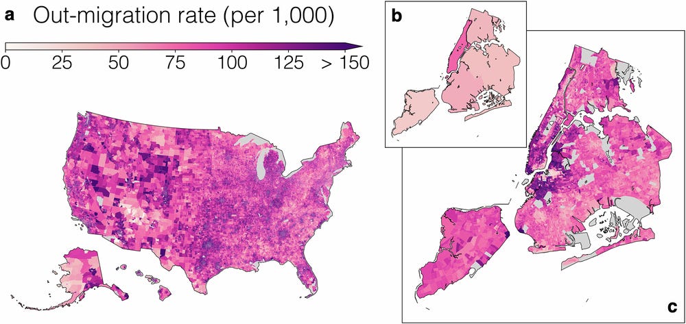 US migration data has essentially been stuck in a âpick oneâ scenario: reliable but clunky Census data that only goes down to the county level, or high-resolution proprietary data that is full of biases. To fix this, researchers have developed MIGRATE, a new dataset that fuses commercial address histories from Infutor with the reliability of Census constraints. By harmonising these sources, they created annual migration matrices between 47.4 billion pairs of Census Block Groups. Thatâs roughly 4,600 times more granular than the standard county-to-county data weâre used to seeing, effectively letting us zoom in from a satellite view right down to the neighbourhood level.