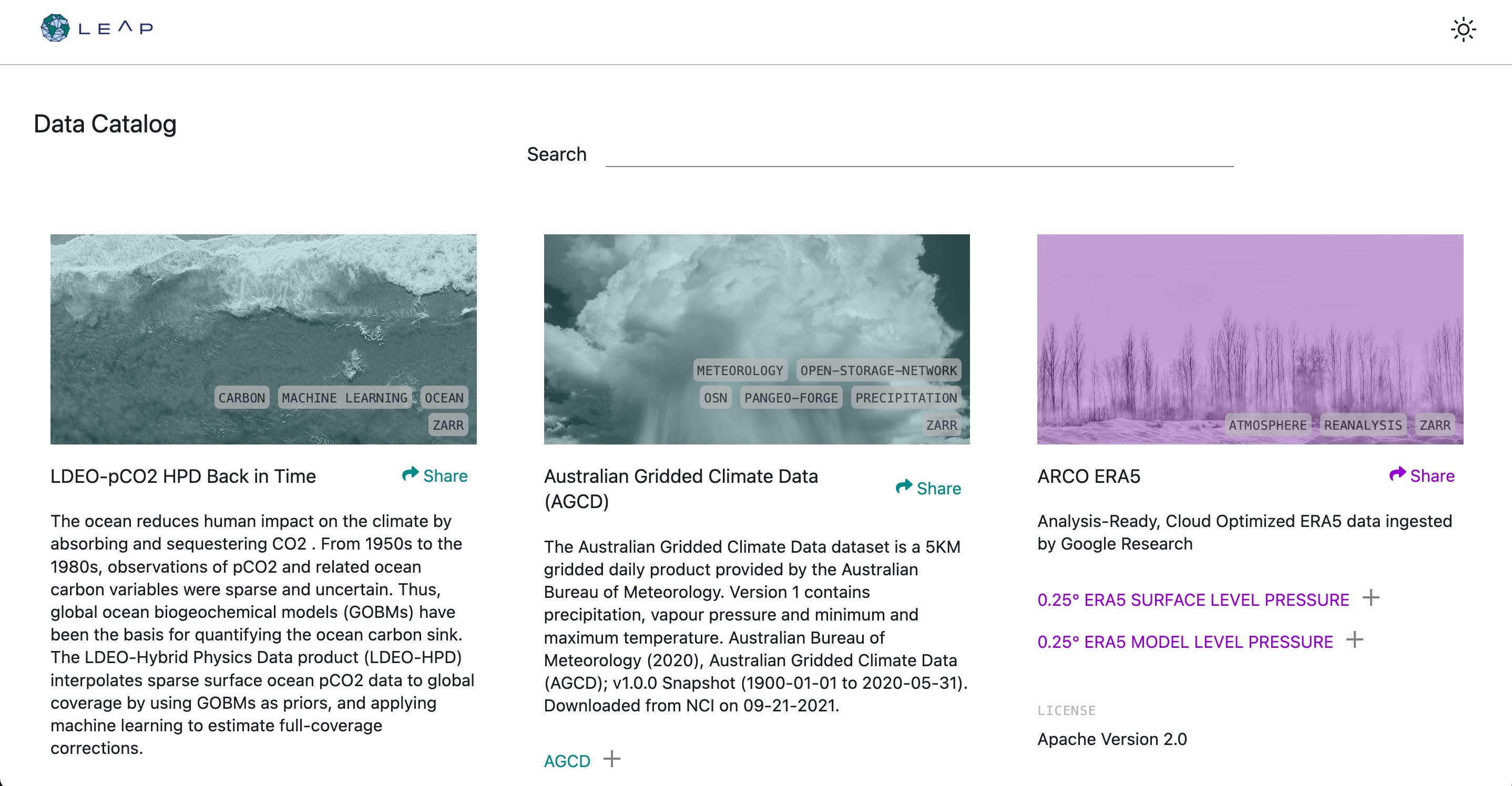 The LEAP (Linked Earth Data for Environmental Research and Decision Making) data catalogue from Columbia University is a comprehensive repository of Earth science data, focused on climate, environmental, and atmospheric research.
