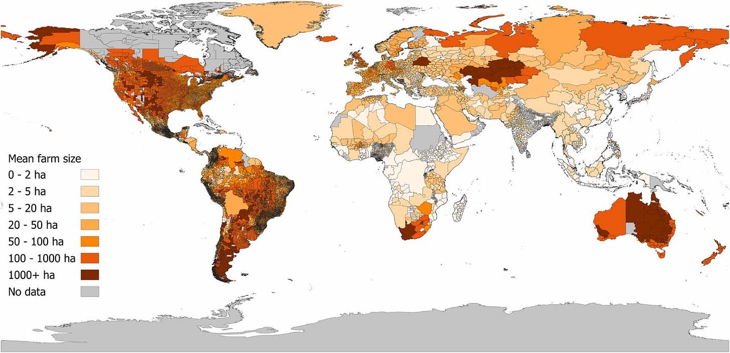 This dataset provides the most comprehensive and spatially detailed empirical assessment of global mean farm size to date, targeting the year 2000. Unlike previous products that rely on national averages or modelled data, this collection compiles census and survey information at the smallest available subnational administrative level for 101 countries, alongside national data for 99 others. You can access the data and code here.