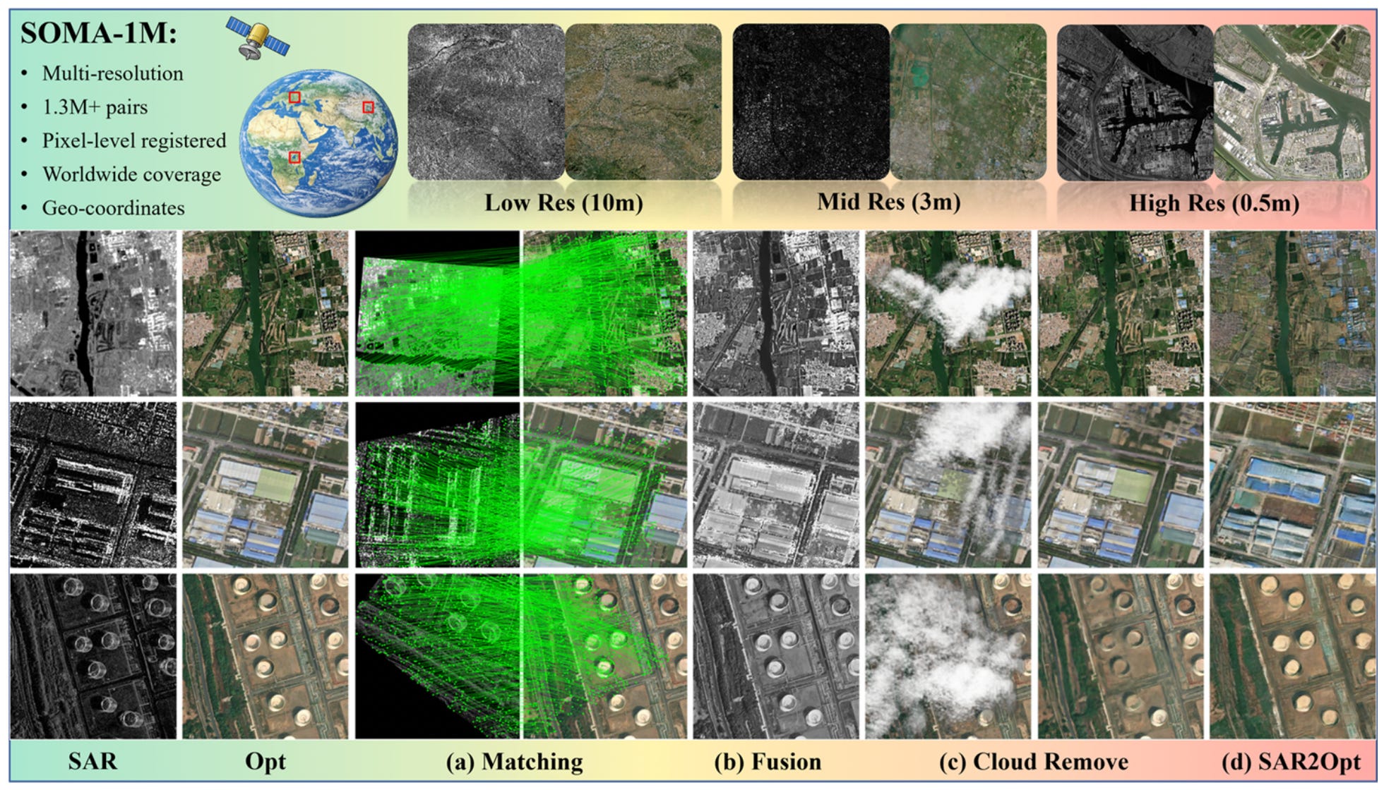 The SOMA-1M dataset offers a massive collection of over 1.3 million precisely aligned Synthetic Aperture Radar (SAR) and optical image pairs. The dataset will be publicly released here.