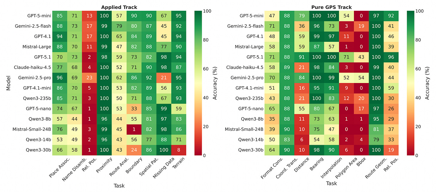 Spatial AI: LLMs struggle with pure GPS math.