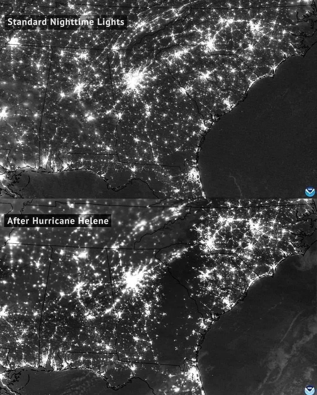 Hurricane Helene caused widespread destruction in the US. Here’s a before and after of night time lights in the region.