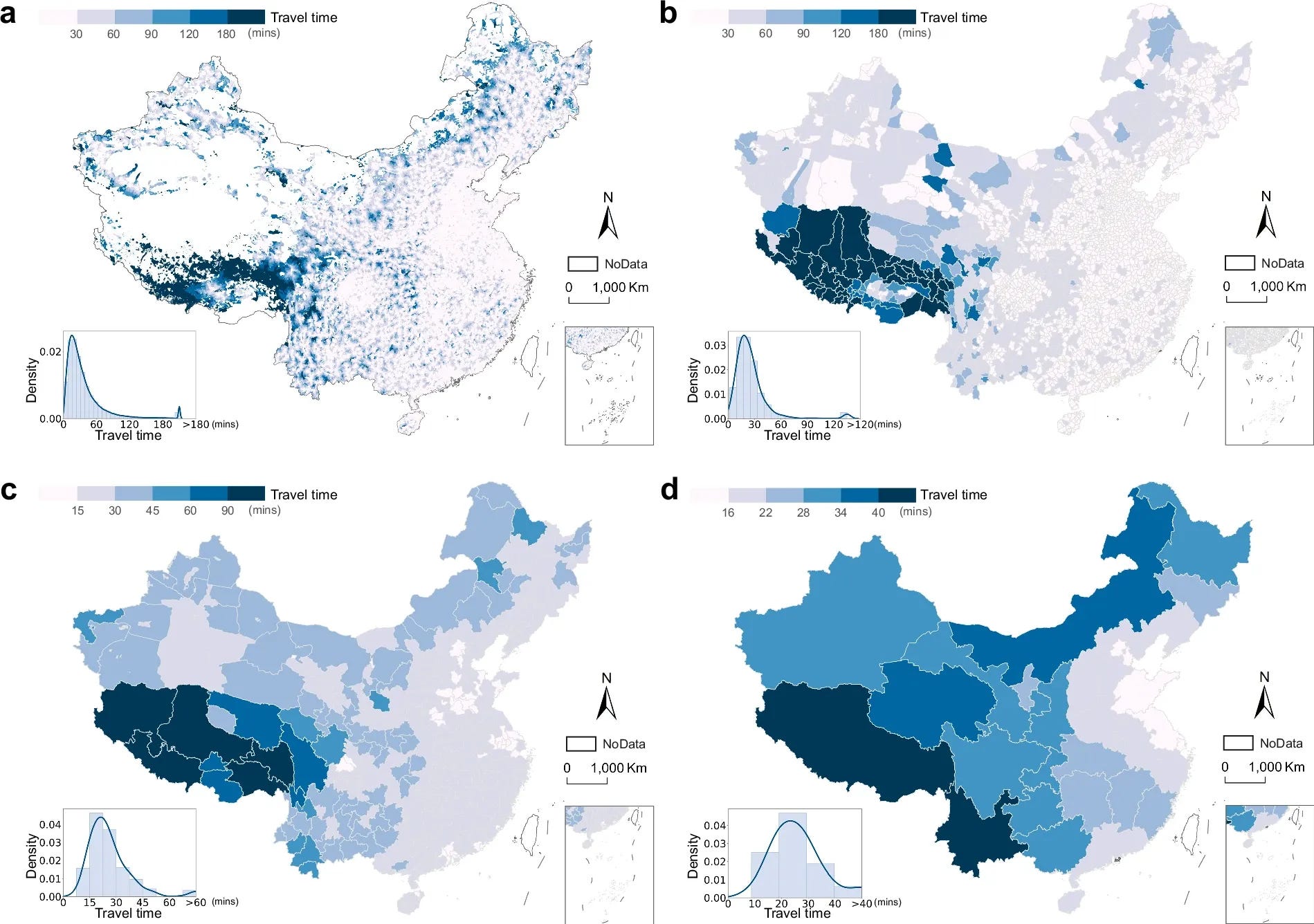 Another paper from Scientific Data provides a detailed map of hospital access across China at a 1km level, focusing on both travel times and hospital capacity relative to local populations. They use OSM and WorldPop data and feed it into a Gaussian two-step floating catchment area (Ga2SFCA) method