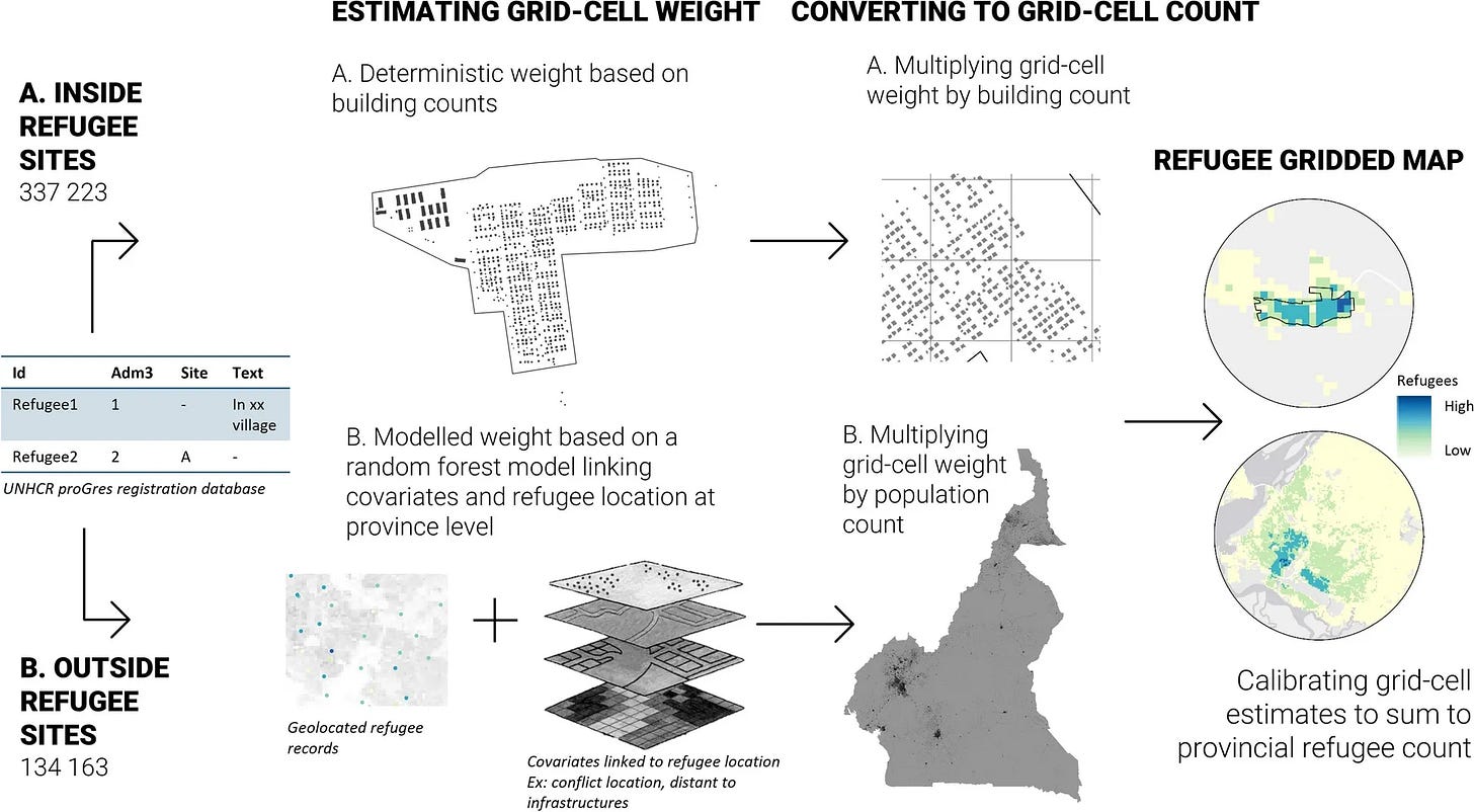 Inside monitored refugee sites, they allocated refugee totals to 100-metre grid cells based on building counts from satellite imagery. For areas outside these sites, they used a random forest model to assign refugee counts across grid cells. The model geolocated textual information from the refugee register (e.g. info on landmarks, and place names) and used covariates like distance to roads and conflict locations.