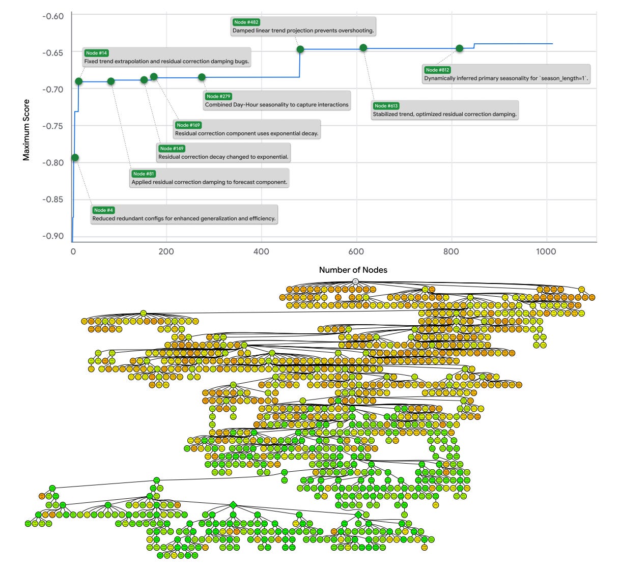 What makes this system different from previous AI coding tools is its ability to dramatically speed up the research process. Tasks that would normally take us mere mortals weeks or months can now be explored in hours or days. The system generates solutions by running whatâs essentially a sophisticated trial-and-error process, testing hundreds or thousands of code variations (they used searches of 300 to 2,000 nodes depending on the problem).
