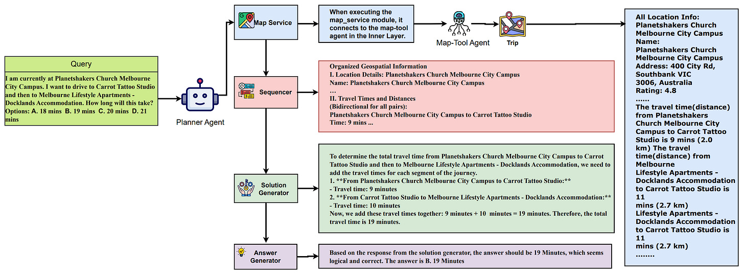MapAgent works through a two-layer system. At the top, a planner agent breaks down complex queries into smaller subgoals and routes them to the right modules. For anything involving maps (like finding nearby places or calculating routes), it hands off to a specialised map-tool agent that manages four core tools built on Google Maps APIs: