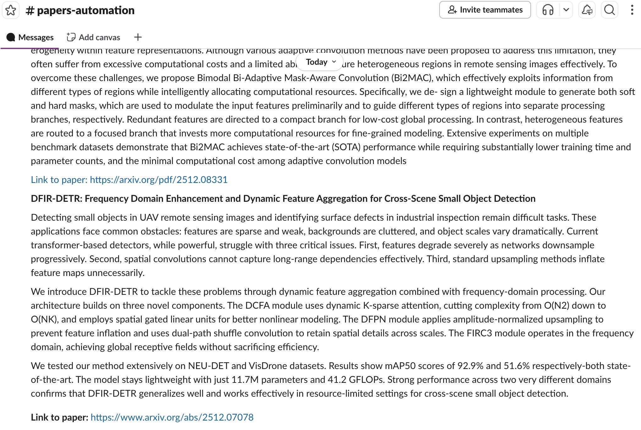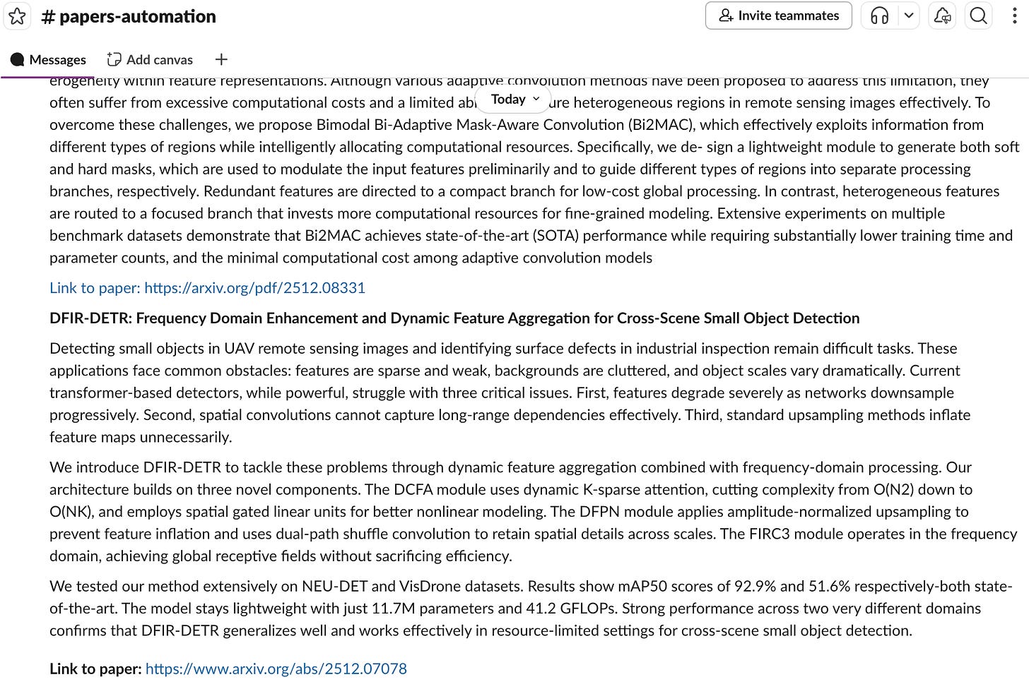 This is set to run every Monday morning. I then wake up to a hundred or so papers with their abstracts located in the #papers-automation channel: