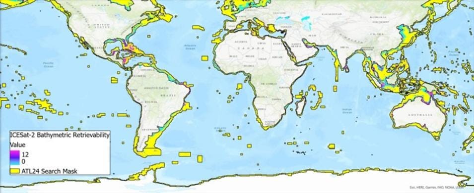 NASA's new ATL24 dataset fills long-standing nearshore data gaps using ICESat-2ās spaceborne lidar to provide global, refraction-corrected seafloor and sea surface heights. You can access the data here or here.