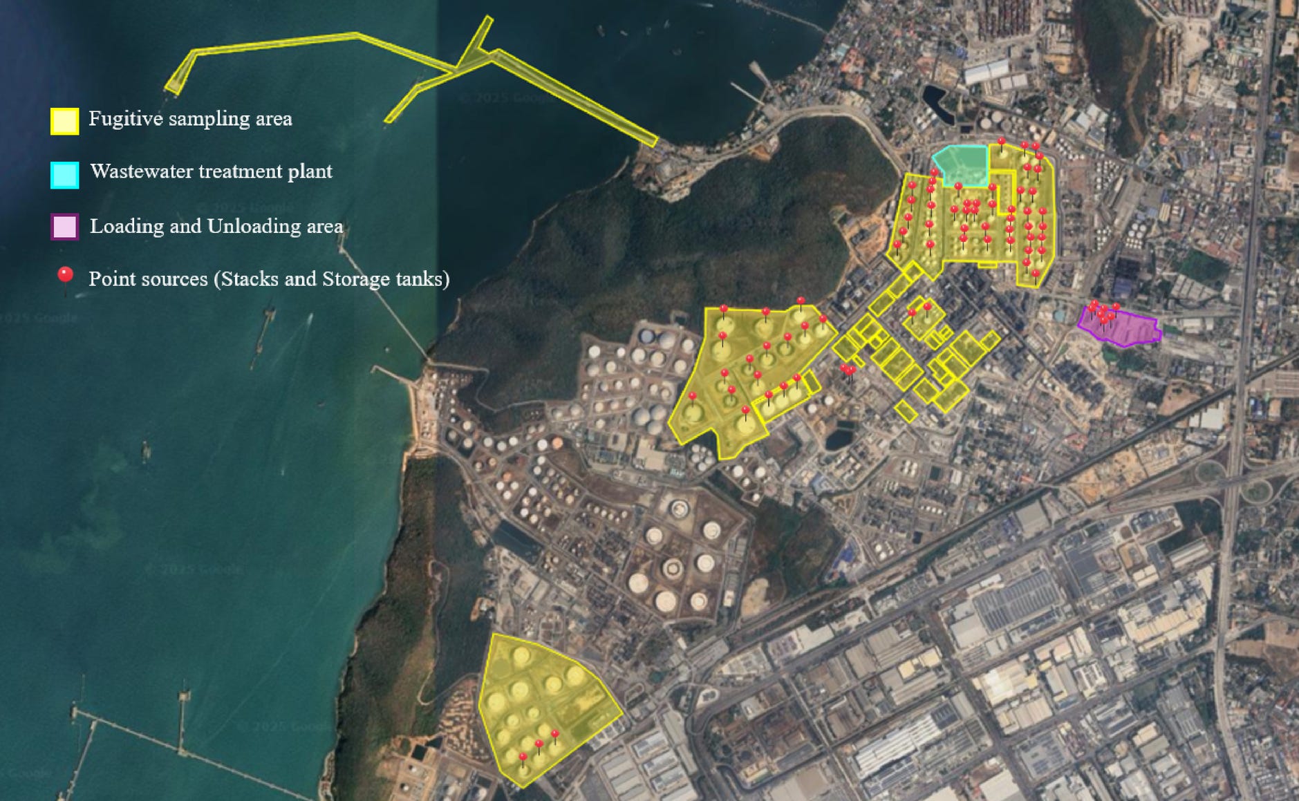 Using wind and terrain data, the team modelled how these emissions spread. Areas downwind of the refinery saw the highest concentrations, especially near the tanks and wastewater unit.