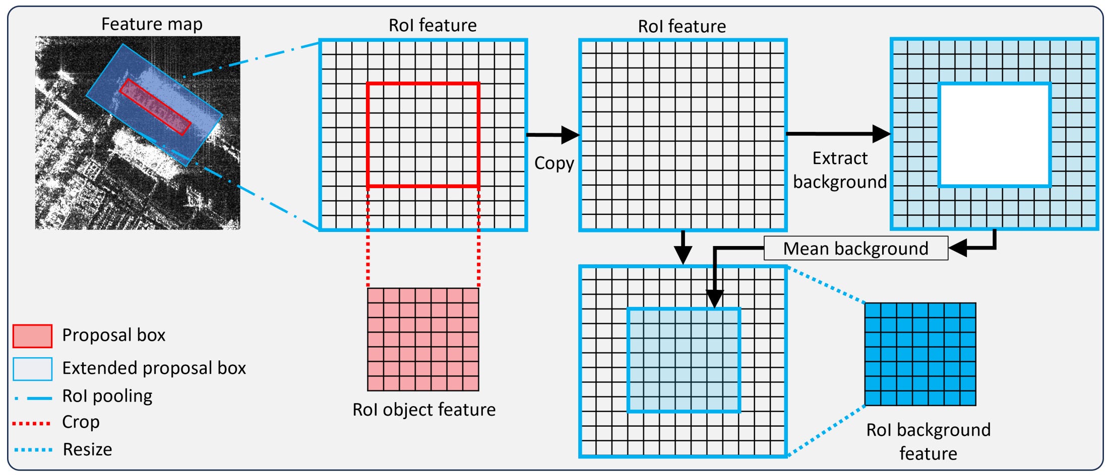 The model pulls in both object and background features in one go, using a single pooling step. Then it blends them using attention, making it better at filtering out false positives and spotting real ships.